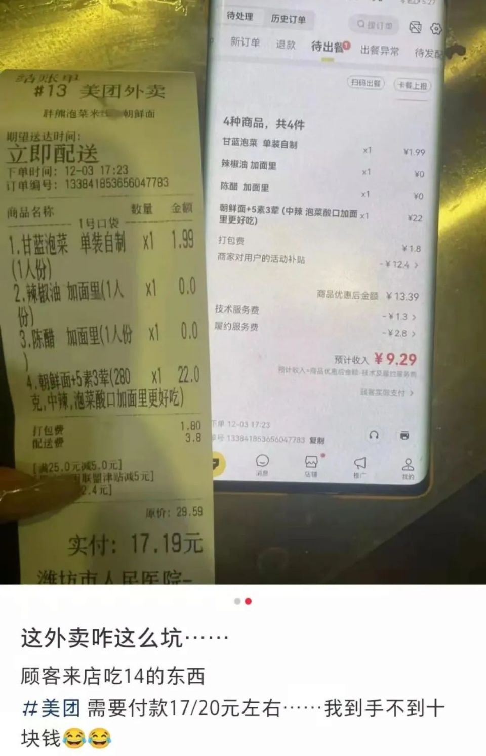 林伟觉得,中小商家过度消耗了平台的红利,早些年大批商家涌入外卖平台,打价格战,已经给消费者留下了便宜的印象,如今低价无法生存,涨价又会失去客源。“平台越做越大,它可以越来越强势,商家没办法反抗,平台对商家的态度是,你死了就死了,要做就做,不做就别来。”