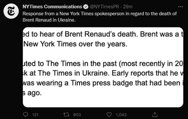 《纽约时报》公关账号(@NYTimes Communications)也于北京时间13日21时左右发布了“《纽约时报》发言人对布伦特·雷诺在乌克兰死亡一事的回应。”