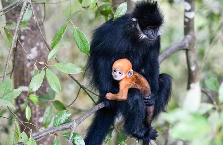 首页 黑叶猴喜添“金宝宝” 2022-03-18 08:29:07 分享 贵州麻阳河国家级自然保护区管理局观测发现,近日,保护区新出生两只黑叶猴宝宝,毛色呈金黄色,几个月后黑叶猴宝宝毛发将逐渐变成黑色。黑叶猴是国家一级保护动物,也是世界上最濒危的灵长类动物之一,在我国主要分布于广西、贵州、重庆等地。近年来,贵州麻阳河国家级自然保护区严格管控黑叶猴活动区域的人类活动,全面防火灾、防盗伐、防偷猎,黑叶猴数量逐年上升。