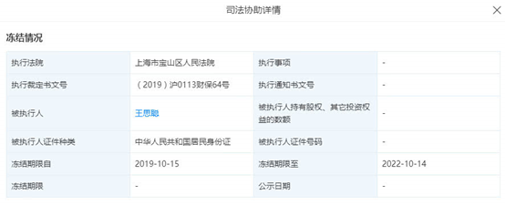 据天眼查相关数据显示,普思投资的股权遭到上海市宝山区人民法院冻结,冻结日期自2019年10月15日起至2022年10月14日。