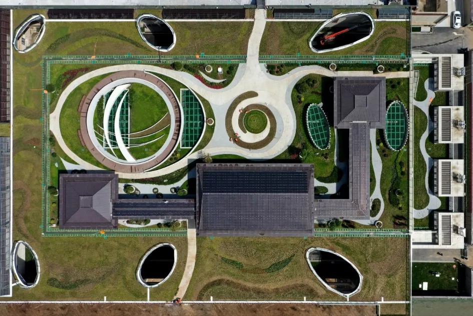 雄安新区首座新建220千伏变电站——剧村站,位于容东片区体育公园内,东临市政道路,北侧和西侧为城市绿地。雄安新区致力塑造轮廓舒展、韵律起伏的城市天际线,钢筋混凝土搭建的变电站如何与城市景观融为一体?