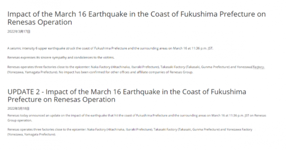 ▲瑞萨公司地震后声明