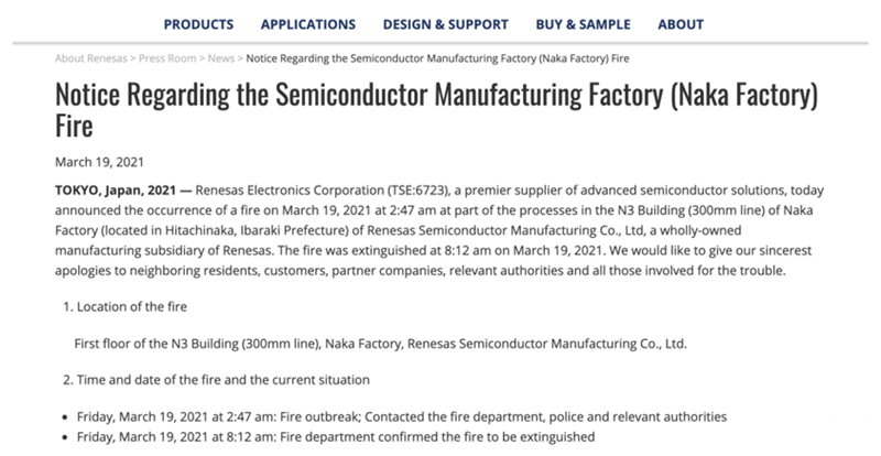 ▲瑞萨2021年3月火灾声明