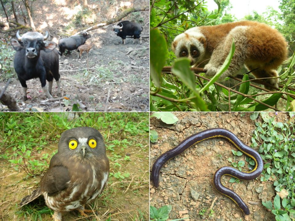 这张拼版照片显示的是西双版纳热带森林地区的部分野生动物,左上图为印度野牛,右上图为蜂猴,左下图为鹰鸮,右下图为版纳鱼螈(资料照片)。新华社发
