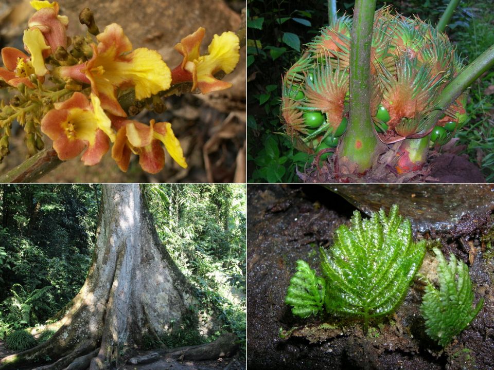这张拼版照片显示的是西双版纳热带森林地区的部分野生植物,左上图为云南石梓,右上图为云南苏铁,左下图为四树木,右下图为南亚孔雀藓(资料照片)。新华社发
