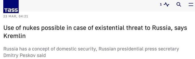 据 报道,当被问及俄罗斯是否可以完全排除使用核武器(的可能性)时,佩斯科夫回答称“我们有一个国家安全概念。而且,你可以阅读到所有使用核武器的理由。因 此,如果它是对我们国家的生存威胁,那么就可以根据我们的战略来使用(核武器)。”佩斯科夫补充称:“还有一些其他的理由,在该文本中也提到了。”