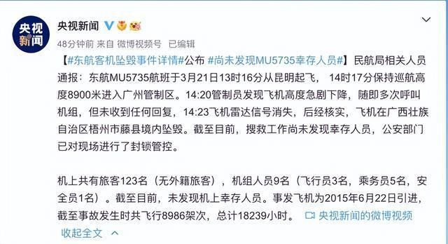 民 航局相关人员通报:东航MU5735航班于3月21日13时16分从昆明起飞, 14时17分保持巡航高度8900米进入广州管制区。14:20管制员发现飞机高度急剧下降,随即多次呼叫机组,但未收到任何回复,14:23飞机雷达信 号消失,后经核实,飞机在广西壮族自治区梧州市藤县境内坠毁。截至目前,搜救工作尚未发现幸存人员,公安部门已对现场进行了封锁管控。