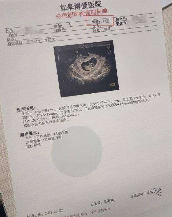 这条信息之所以引发舆论高度关注,是因为这起事件涉及未成年人犯罪。根据网上疯传的检查报告单,我们可以清楚地看到这是一份彩超报告单,报告单上显 示的医院是如皋博爱医院。患者是一位13岁的女孩。彩超报告显示,这名女子早孕宫内妊娠,胚胎存活,双侧卵巢未见明显占位,盆腔积液。检查时间显示是 2022年3月22日。