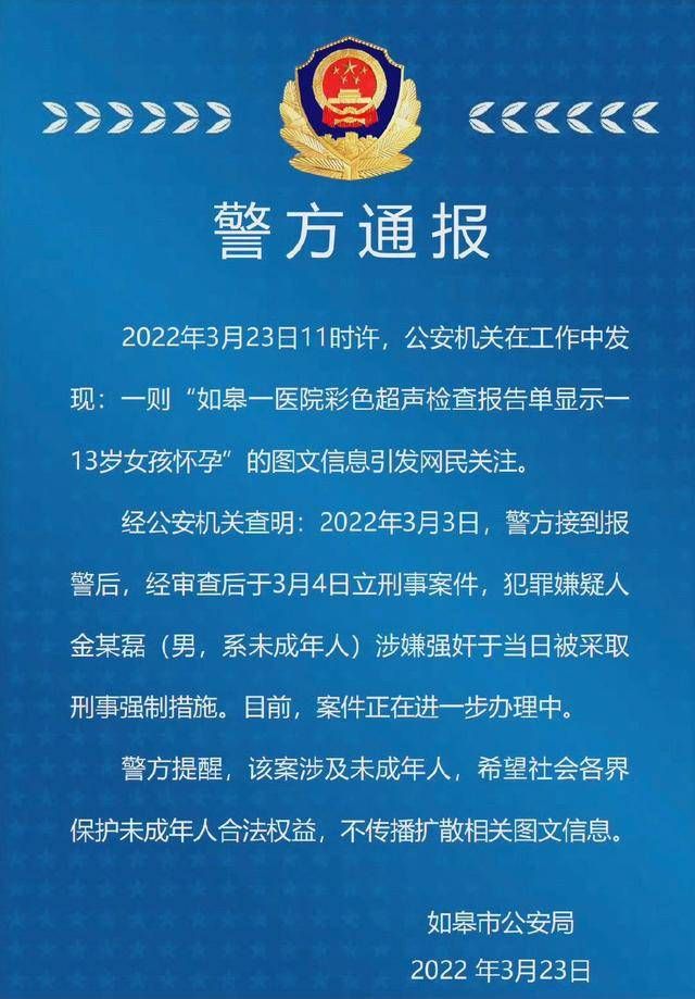 通报称,2022年3月23日11时许,公安机关在工作中发现:一则“如皋一医院彩色超声检查报告单显示一13岁女孩怀孕”的图文信息引发网民关 注。经警方调查发现:2022年3月3日,警方接到群众关于该案件的报警后,立即组织警力进行调查,并于3月4日立为刑事案件,同一天,犯罪嫌疑人金某磊 (男,系未成年人)涉嫌强奸于当日被采取刑事强制措施。目前,案件正在进一步办理中。