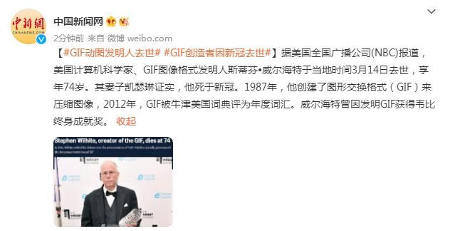 科创 GIF动图发明人因新冠去世 2022-03-24 11:09:00 分享 据美国全国广播 公司(NBC)报道,美国计算机科学家、GIF图像格式发明人斯蒂芬威尔海特于当地时间3月14日去世,享年74岁。其妻子凯瑟琳证实,他死于新冠。 1987年,他创建了图形交换格式(GIF)来压缩图像,2012年,GIF被牛津美国词典评为年度词汇。威尔海特曾因发明GIF获得韦比终身成就奖。来源:中新网