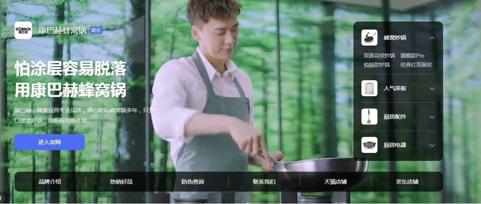进入官网后,主页并无产品介绍,而是直接跳转到“康巴赫翰翰专卖店”。根据其天猫店铺中的产品介绍显示,王先生购买的这类蜂窝锅,宣称物理不粘,该产品使用的是蜂窝纹理防粘原理,蜂窝密度增大,防粘性就会提升。
