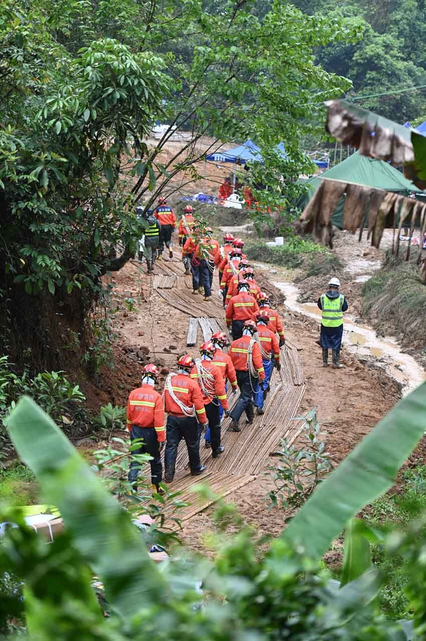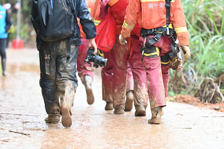 3月24日下午,广西梧州市藤县埌南镇莫埌村,消防救援人员背负绳索等工具进入核心搜救区。