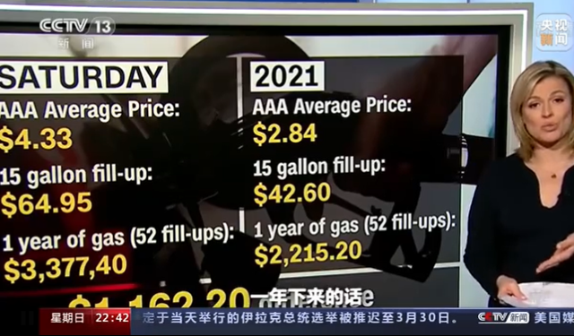 CNN主播:“如果你的汽车油箱是15加仑(约60升)的容量。加满一箱油需要65美元,一年下来的话,即便你一周只加一次油,一年要花超过3300美元。这与一年前相比,要多花1700美元。”