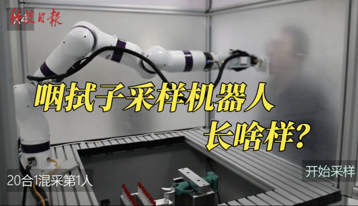 科创 有效率100%!咽拭子采样机器人“大白”面世 2022-03-31 10:18:19 分享 通讯员 宫昭 制作 赵卫华 何沛苁 李忠明为保护采 样人员、节省人力,清华大学现代机构学与机器人化装备实验室与烟台清科嘉机器人联合研究院有限公司联合研发了咽拭子采样机器人,面向大规模全员核酸检测中 的10合1、20合1等混采检测,替代医护人员完成咽拭子采样、样品保存液回收、病毒消杀等功能,采样效率高达42秒/人次,采样有效率100%,为科学 有效应对新冠肺炎疫情传播风险提供有力保障。
