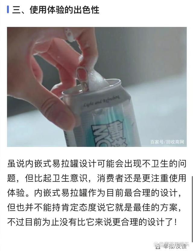 “现 在疫情期间,我这种喜欢喝易拉罐饮料的一直有一个心里的忌讳,就是易拉罐扣环都是往里开,每次喝之前都要擦一下,但是其实就是心理安慰,也起不到消毒作 用,很怕不卫生。所以上网查了一下,为什么易拉罐从以前往外开变成往里开,的确有效率和便捷之处。但是在疫情期间,卫生和安全的考虑是否放在第一位更合 适,不知道哪位贴心的厂商能解决这个问题,同时如果往外开,喝完易拉罐用户是可以把扣环放进罐子里的,这样既能解决回收的问题,也能培养我们一个环保的好 意识和好习惯,也比较卫生。”