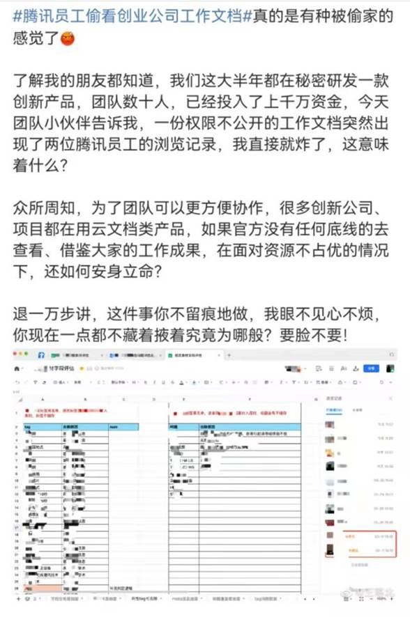 该博主称,团队数十人大半年都在秘密研发一款创新产品,已经投入了上千万资金,今天团队小伙伴发现该腾讯文档出现了两位腾讯员工的浏览记录,但文档权限设置为不公开。