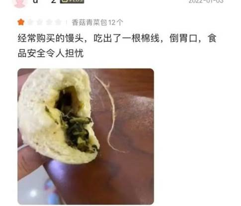在京东平台,有网友在包子里吃出棉线和塑料棒。“经常购买的馒头,吃出了一根棉线,倒胃口,食品安全令人担忧”、“这是第二次吃,吃了两个之后嗓子觉得有异物,一个吞下去了,一个吐出来了,(发现一个)彩色塑料棒”。