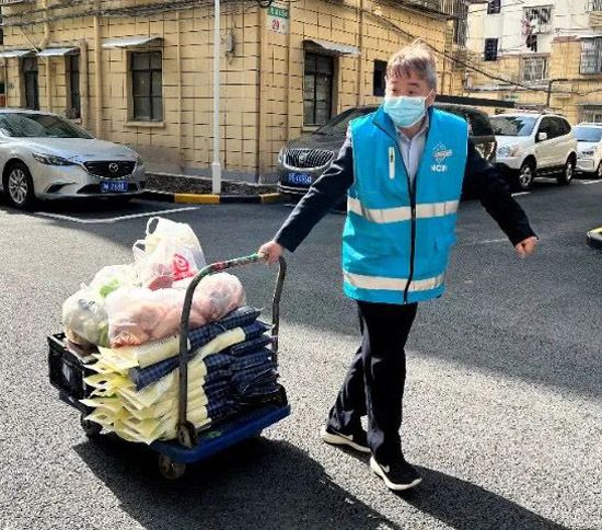 长宁区仙霞新村街道,仙霞物业公司负责管理的一封控小区,老年人比较多,被封控之后,他们不会使用智能手机上网购买生活物资。因此,物业工作人员便成了小区的“闪送员”,主动承担起为小区独居老人、高龄老人和行动不便老人采购生活物资的工作。长宁融媒体中心供图