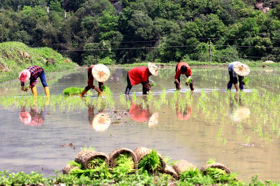 人民网南安4月1日电 (林晓丽)田家勤力作,蓑笠事春耕。在福建省南安市英都镇良山村,村民们正在农田里紧锣密鼓地进行春播。