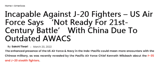 多 家西方媒体还注意到,就在称赞歼-20和空警-500的同时,威尔斯巴赫却在感叹美国空军装备的E-3预警机严重老化,“它们配备的传感器在21世纪的空 战中无法发挥真正的能力,尤其是对抗歼-20或类似的隐形平台。E-3对这些目标的探测距离不够,导致己方战斗机无法获得优势。”