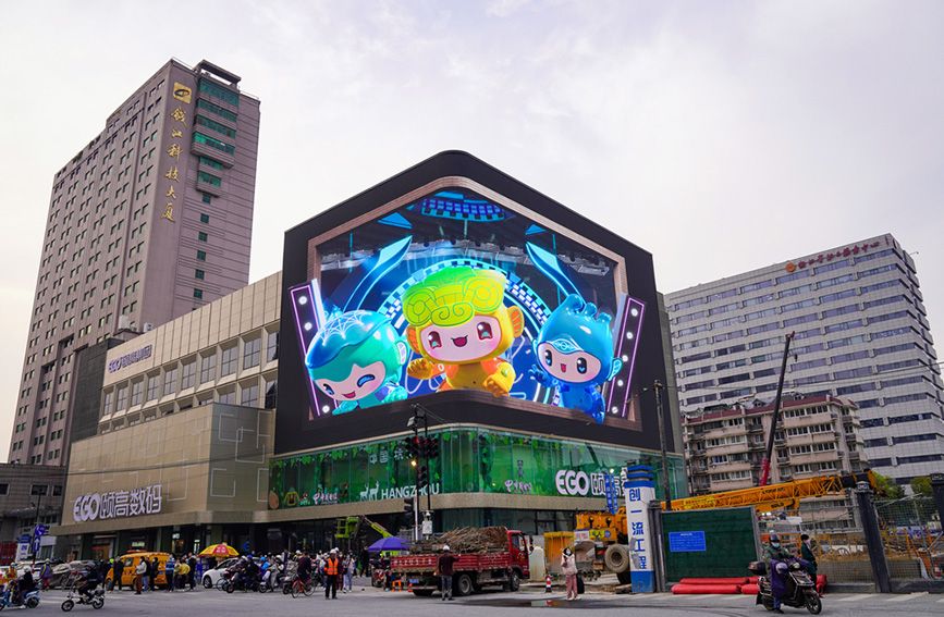 4月1日,2022年杭州亚运吉祥物裸眼3D宣传片在杭州市西湖区文三数字生活街区开播。这是杭州亚运吉祥物的3D形象首秀,市民可通过大屏与其“零距离”互动,感受“数智+亚运”的魅力。
