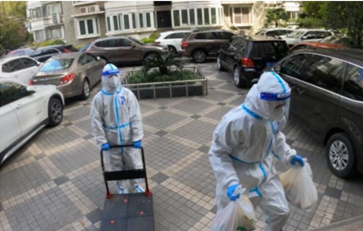 4月1日上午10点13分,一辆满载蔬菜的货车驶进位于上海浦东曹路镇的银丰苑小区。图为志愿者们为居民搬送物资。葛俊俊摄