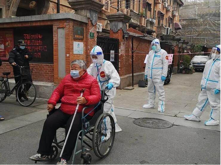 4月1日,上海启动新一轮核酸筛查,住在杨浦区五角场街道第十宿舍的李奶奶因行动不便难以下楼,医护人员和志愿者上门服务。杨浦区供图