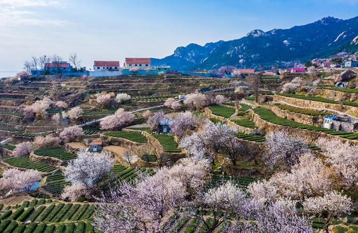 2022年4月2日,山东省青岛市崂山雕龙嘴村的樱桃花竞相绽放,与茶园梯田相映成景,美不胜收。杨雪梅摄(人民图片网)