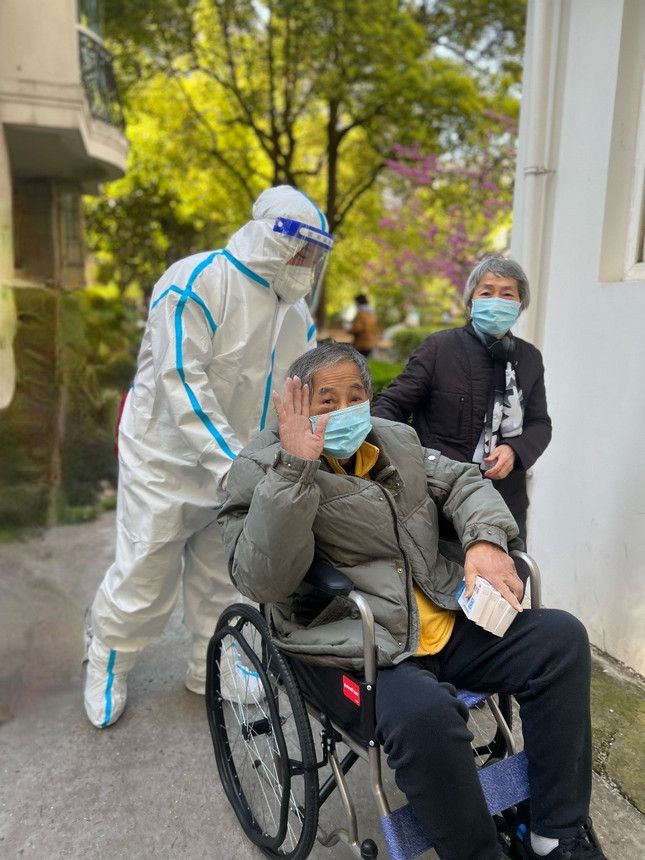 杨浦区控江街道的小区志愿者,核酸检测后帮助行动不便的居民回家。人民网 马丽摄