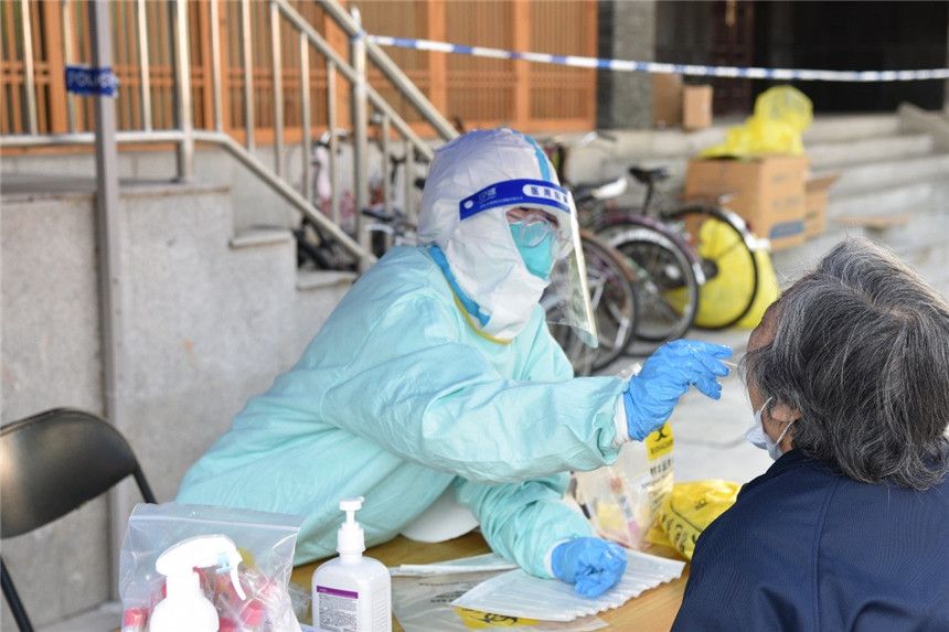 上午11:00,来自南京鼓楼医院的医生在浦东新区花木街道一小区做核酸采样。人民网 陈晨摄