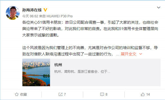 10月22日早,51信用卡创始人孙海涛在其个人微博上发文表示了自责和歉意,解释称,风波起因源于管理上的不完善,因为该公司对合作公司的培训和监督缺乏,导致与借款人联络沟通过程中出现了一些过激的行为,给个别借款人造成了伤害。