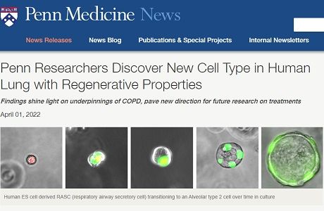 在这项研究中,宾夕法尼亚医学院研究人员在分析人类肺组织时发现了这种新细胞,并将其命名为“呼吸气道分泌细胞”(RASC)。这些细胞排列在位于 肺部深 处的微小气道分支上,靠近肺泡(专门用来交换氧气和二氧化碳的场所)。此外,RASC拥有类似干细胞的特性,能再生为对肺泡正常功能至关重要的其他细胞。 而吸烟和与吸烟有关的慢性阻塞性肺病(COPD)会破坏RASC的再生功能,阻止这种破坏可能是治疗COPD的好方法。