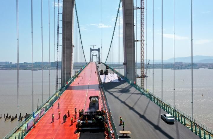 科创 浙江温州:瓯江北口大桥铺设沥青 2022-04-07 08:47:59 分享 2022年4月5日,在浙江省温州市瓯江北口大桥上层,工人们正在铺设沥青。瓯江北口大桥连接乐清市黄华与温州灵昆岛,大桥上层为甬莞高速,下层为 G228国道,全长7.9公里,其中跨越瓯江的主桥长2090米,是世界首座三塔四跨双层钢桁梁悬索桥。蔡宽元摄(人民图片网)