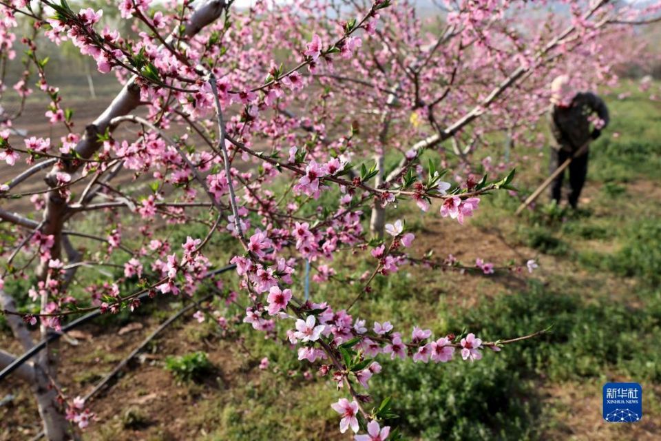 4月10日,山东省枣庄市齐村镇前良村农民在桃园里劳作。