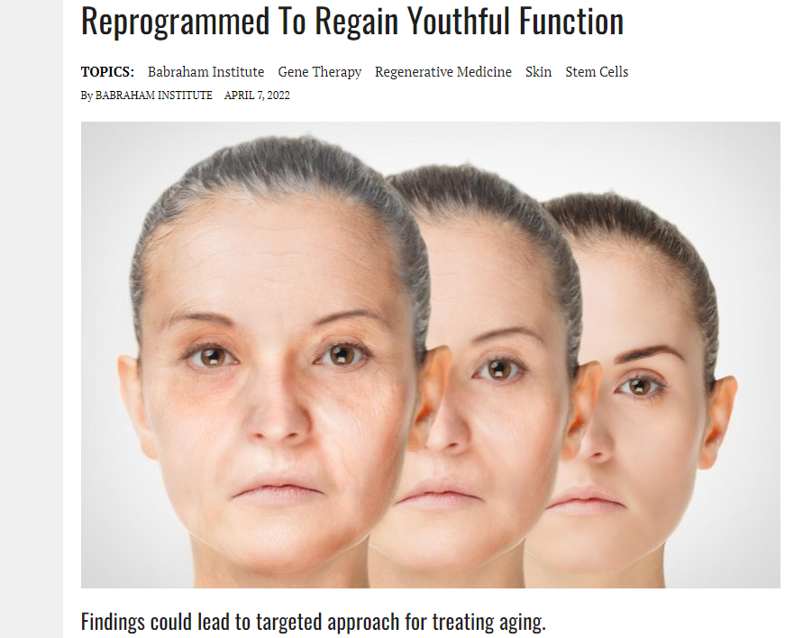随着人年龄不断增长,细胞的功能下降,基因组会积累很多衰老生物标记。再生生物学旨在修复或替换细胞,实现这一点最重要的一个方面是创造出“诱导”干细 胞。2007年,日本科学家山中伸弥首次成功将拥有特定功能的正常细胞转化为拥有能发育成任何细胞类型能力的干细胞,他对干细胞进行重新编程约需50天, 用到了4种被称为“山中因子”的关键分子。