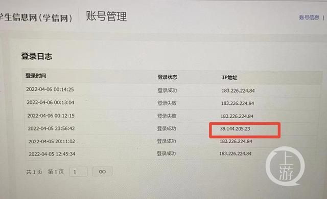 小张还向记者发来了登录时显示的IP地址。记者查询发现,多个地址IP显示为重庆,但其中有一个地址显示为新疆,登录时间都为深夜或者凌晨。