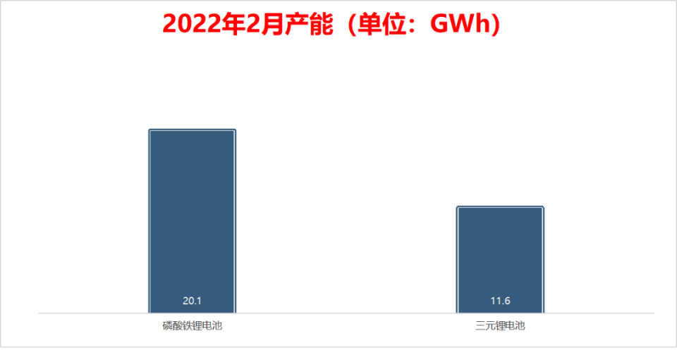 据电池联盟的数据显示,2022年2月磷酸铁锂电池的产量为20.1GWh,同比增长364.1%;三元锂电池的产量为11.6GWh,同比增长127.2%。