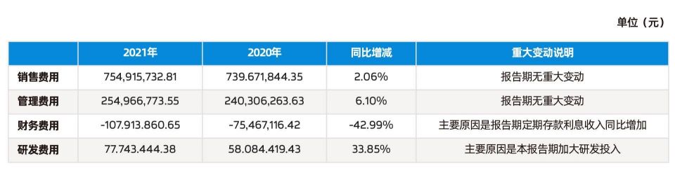 财报显示,公司2021年度的期间费用率达27.88%,经营活动现金净流量仅为5.45亿元,相比上一年度减少逾3600万元。其期内销售费用为7.55亿元,同比增加2.06%,管理费用为2.55亿元,同比增加6.1%。
