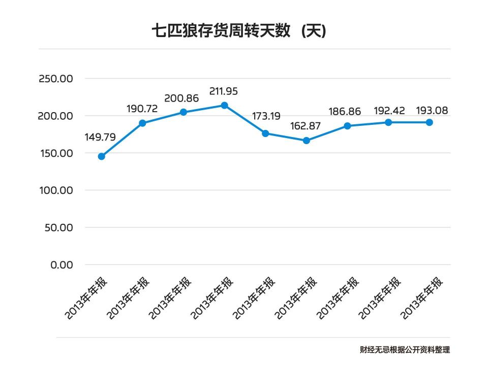 这也是七匹狼的老问题。其存货周转天数在2012年只有114天,到2016年达到了211天。而同样做男装的中国利郎的存货周期则只有66-160天。对此,七匹狼解释为经营模式的不同,导致其的库存周期比同行相对较高。