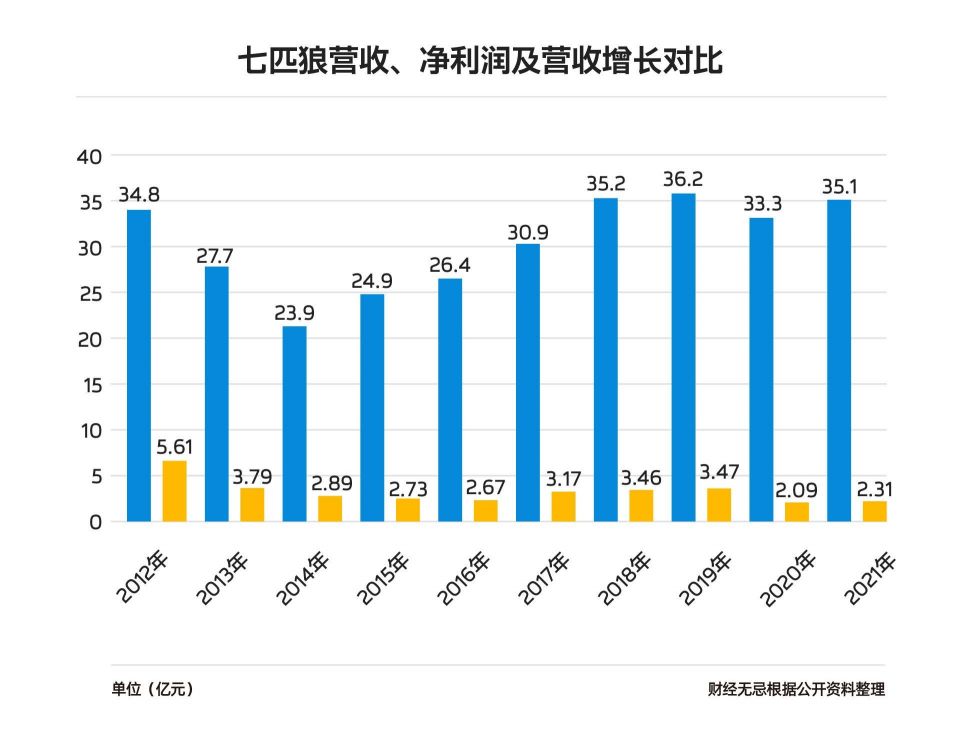 显然,这一小步并不足以让七匹狼重新像昔日一样在广阔的大地上奔跑——在过去的十年里,七匹狼是中国男装品牌中一个很有意思的存在,在2012年达到34.77亿元的营收峰值后,七匹狼的营收水平就像上证指数怎么都绕不开“3000点”一样,一直在原地踏步。