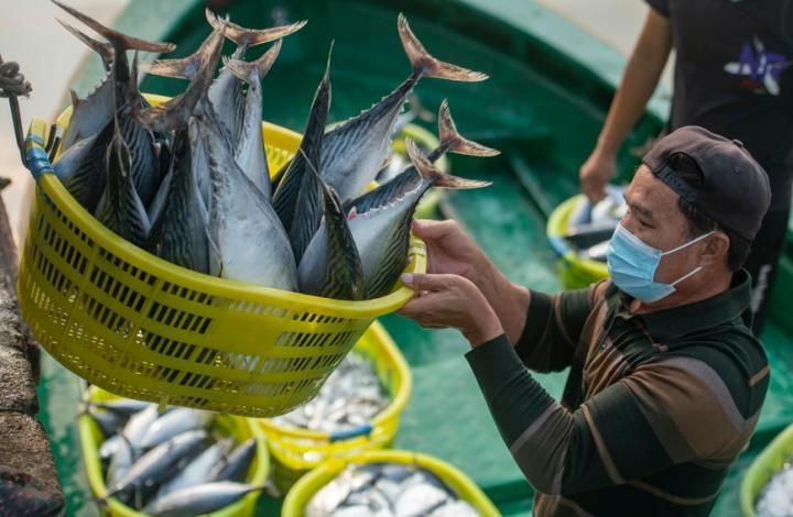 暮春时节,海南琼海持续阳光明媚的好天气,渔民加紧进行海洋捕捞。每天早晨,一艘艘渔船沐浴春光满载而归。蒙钟德摄(人民图片网)