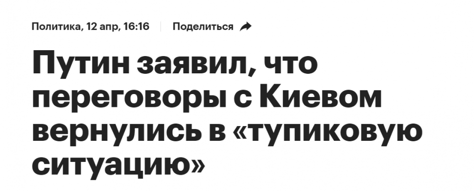 首页 普京:基辅已脱离此前共识,俄乌谈判陷入僵局 2022-04-13 10:39:14 分享 【环球网快讯】据俄新社、《俄罗斯商业咨询日报》12日最新报道,俄罗斯总统普京与白俄罗斯总统卢卡申科当天举行记者会,谈及俄乌谈判。普京称,基辅“脱离”俄乌双方在伊斯坦布尔谈判时达成的共识,俄乌谈判陷入僵局。《俄罗斯商业咨询日报》:普京称与基辅的谈判陷入“僵局”
