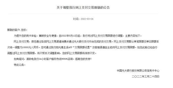 光大银行信用卡中心在公告中,则明确了包括各类网上交易渠道消费在内的网上支付交易限额:“自2022年5月12日起,网上支付交易默认单笔限额及单日限额本次统一调整为1万元人民币。”