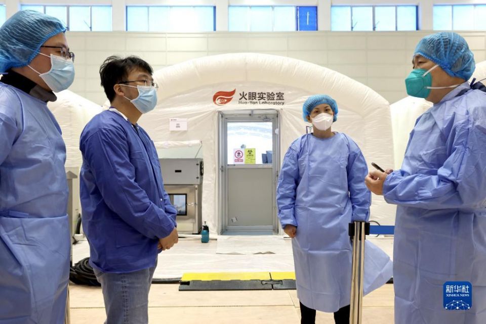 科创 新一代火眼实验室在上海建成并投入运营 2022-04-15 08:07:24 分享 4月14日,江苏援沪医疗队有关人员(右一)在火眼实验室与实验室负责人沟通合作事宜。为进一步提升新冠病毒核酸检测能力,助力上海抗疫工作,一座总面积为2000平方米的火眼实验室近日在上海市闵行区旗忠网球中心火速建成。该实验室由9个负压软气膜舱组成,可同时开展两组核酸样本的信息录入、灭活、提取、分析等操作。若按10人一管的混采比例来算,单日即可出具100万人次的核酸检测报告。作为新一代火眼实验室,它配备了上百台先进的自动化处理设备,可实现大通量、高效率的核酸检测需求。新华社记者 陈建力 摄