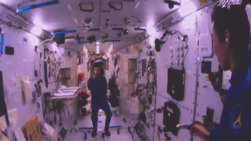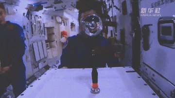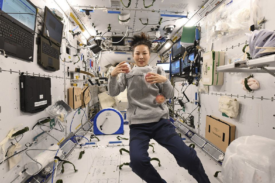 ↑王亚平在天和核心舱吃苹果前“耍杂技”。