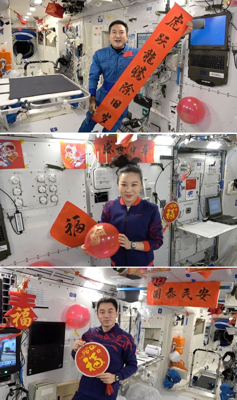 2022年1月31日,农历除夕,神舟十三号航天员在遥远的太空专门发来视频,向祖国和人民送上祝福。拿着对联的指令长翟志刚说: “祝大家新春快乐,身体健康,万事如意。”;身着喜庆服装的王亚平祝全国小朋友们“生龙活虎、茁壮成长”,祝福我们伟大的祖国“福虎生旺、繁荣富强”;叶 光富手持“福”字祝愿全国人民“新春愉快、阖家幸福”。