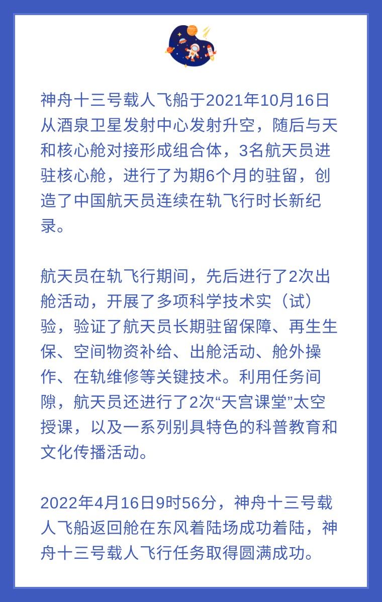 据中国载人航天工程办公室消息,北京时间2022年4月16日9时56分,神舟十三号载人飞船返回舱在东风着陆场成功着陆。现场医监医保人员确 认航天员翟志刚、王亚平、叶光富身体状态良好,神舟十三号载人飞行任务取得圆满成功,标志着空间站关键技术验证阶段任务圆满完成,中国空间站即将进入建造 阶段。