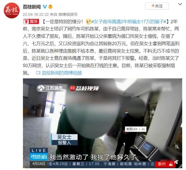 2年前,南京吴女士结识了网约车司机陈某,由于自己离异带娃,陈某常来帮忙,两人不久便成了朋友。随后,陈某开始以父亲重病为借口找吴女士借钱,在借了六、七万元之后,又以投资返利为由让其转账20万元,但在吴女士拿到两笔返利后,陈某就以各种理由推脱不给本息,最后竟将吴女士拉黑。不料无巧不成书的是,近日吴女士竟在商场偶遇了陈某,于是将其拦下报警。经查,当时陈某欠了50万网贷,认识吴女士后一开始就在打钱的主意。目前,陈某已被采取强制措施。微博截图来源:荔枝新闻微博