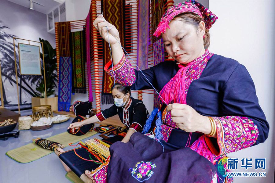 非物质文化传承人现场进行苗绣、黎锦制作展示。新华网发
