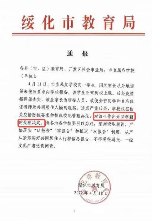 据@九派新闻消息 4月19日,网上流传一张落款为“绥化市教育局”的通报。通报称,4月11日,绥化市直属一学校高一学生,因其家长从外地返绥未按要求向学校报备,对该生做出开除学籍的处理决定。该通报立即在网上引起了热议。